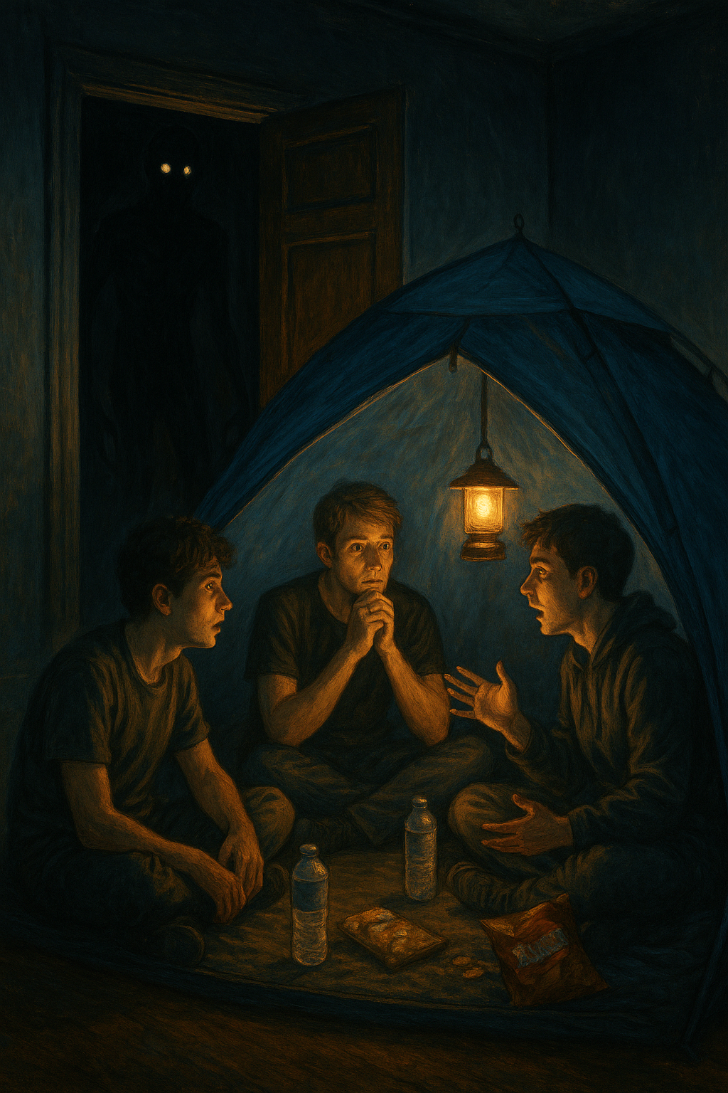 Three friends sit in a tent telling scary stories as a shadowy figure watches from an open closet behind them. Other you can read in book
